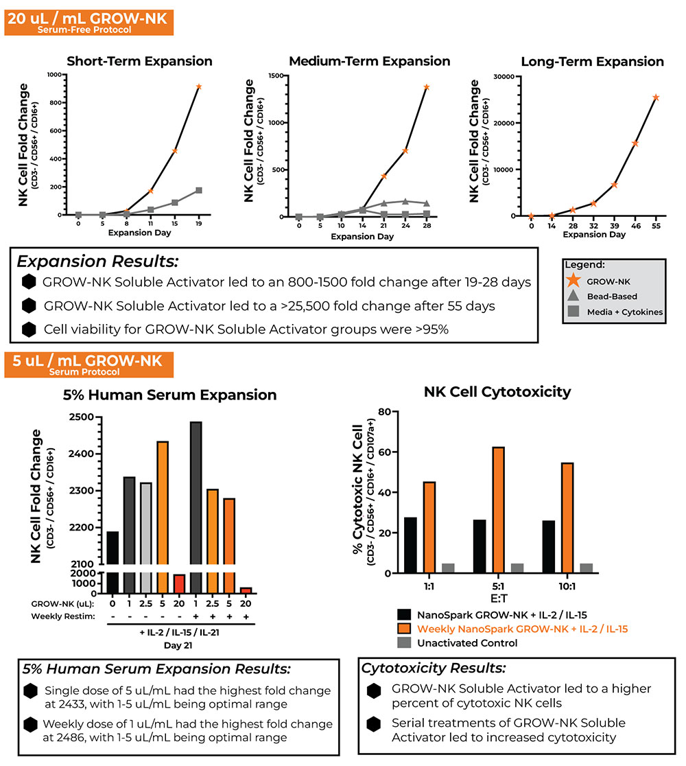 The NanoSparkTM GROW-NK Soluble Activator is a culture-ready, feeder-free reagent for in vitro activation and expansion of human NK cells. The nanoscale of the NanoSparkTM GROW-NK protein complex allows for sterile filtration and removal of excess reagent via either media exchange or simple centrifugal cell washing.
